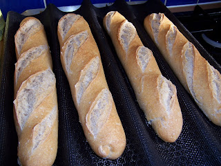 Нагрет духову  до 240°C , смочить хлеб водой (или збрызнуть), вставить в духовку и  вылить маленький стаканчик воды на (enfournez et jetez un petit verre d’eau sur votre lèche frite )